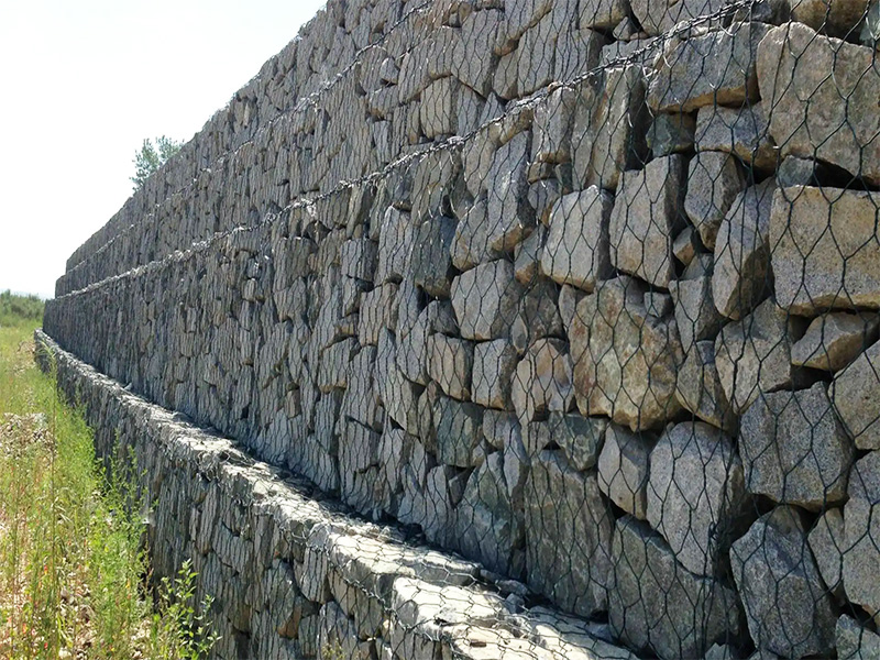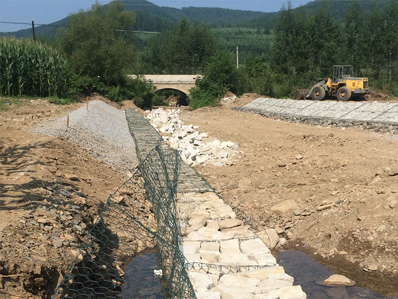 綠格石籠網(wǎng)又稱“格賓網(wǎng)”、“石籠網(wǎng)”,由各種網(wǎng)孔規(guī)格的綠格石籠網(wǎng)片按照ASTMA975-97規(guī)范組裝而成,工程現(xiàn)成填充石料組裝形成柔性的、透水的、整體的支擋結(jié)構(gòu),常用于生態(tài)防護(hù)工程。該結(jié)構(gòu)采用高鍍鋅鋼絲或者10%鋅鋁合金鋼絲經(jīng)過雙線絞合編織而成的,其雙線絞合部分的長度不能低于45㎜,以保證絞合部分的防腐性能不被破壞。如果環(huán)境比較惡劣,污染比較嚴(yán)重,可以再鋼絲的表面涂塑(包PVC)增強(qiáng)鋼絲的抗腐蝕性能。