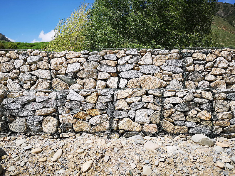 石籠擋墻是由工廠按照設(shè)計(jì)尺寸規(guī)格加工成雙扭結(jié)六角形的網(wǎng)目后,現(xiàn)場(chǎng)拼裝成箱式網(wǎng)籠或墊式網(wǎng)籠,網(wǎng)籠施工主要是立架、裝料、砌平及封口等。